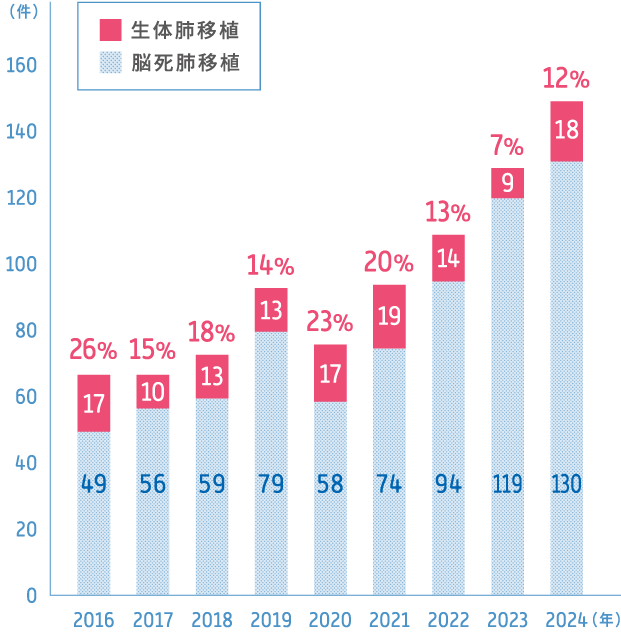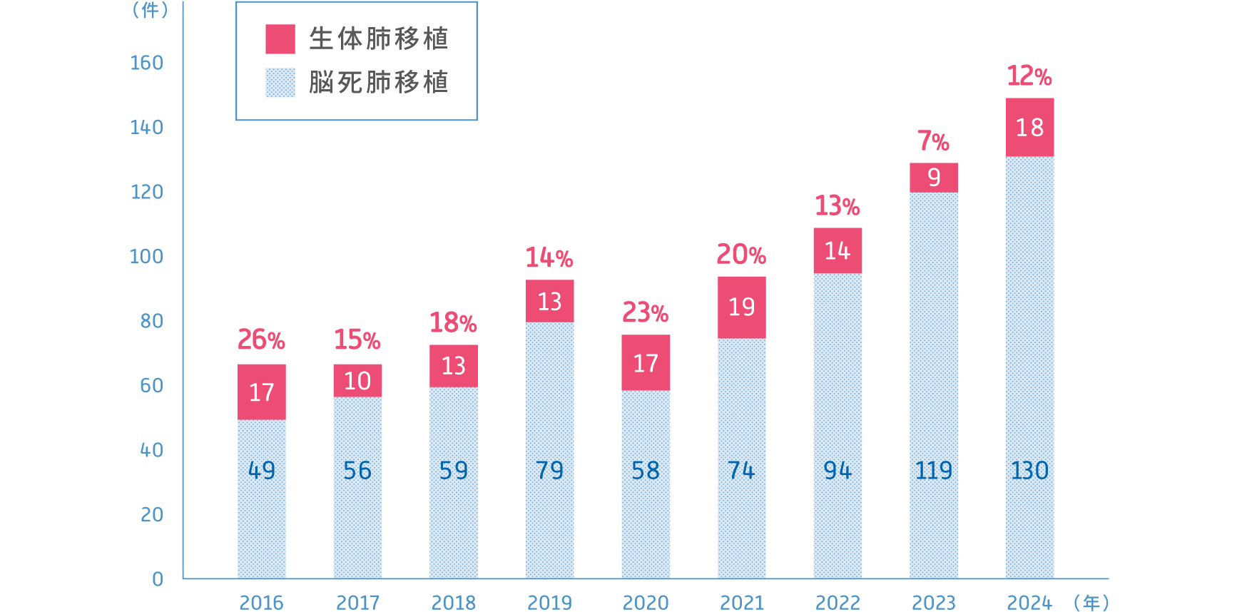 レジストリーレポートより「臓器移植=脳死移植」というイメージが強いですが、実際には今も肺移植全体の10%前後、多い年には20%近くを生体移植が担っています。脳死移植の件数が伸び悩む日本においては、 生体肺移植は現実的な治療の選択肢として十分検討する素地があると言えます。